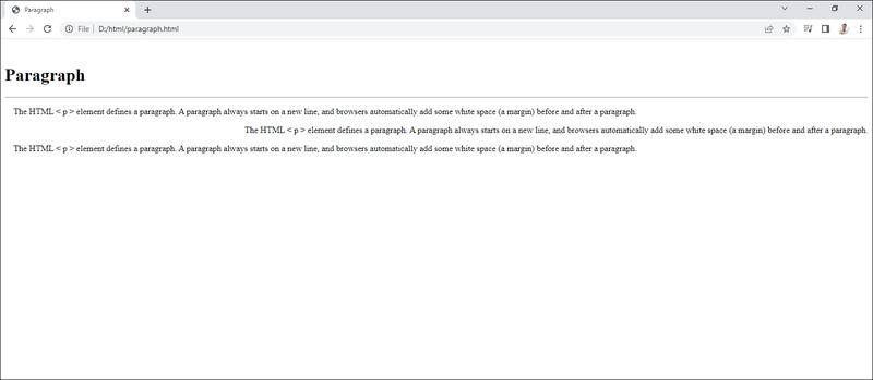 <p align="right">The HTML < p > element defines a paragraph. A paragraph always starts on a new line, and browsers automatically add some white space (a margin) before and after a paragraph.</p>
