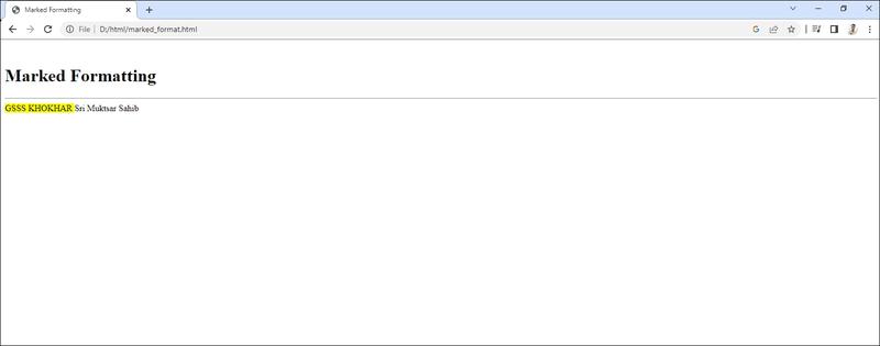 - Strikethrough (ਸਟ੍ਰਾਈਕਥ੍ਰੋ): <s> ਟੈਗ ਦੀ ਵਰਤੋਂ ਟੈਕਸਟ ਤੇ ਸਟ੍ਰਾਈਕਥ੍ਰੋ ਇਫੇਕਟ ਲਾਗੂ ਕਰਨ ਲਈ ਕੀਤੀ ਜਾਂਦੀ ਹੈ। ਇਹ ਵੀ ਇੱਕ ਪੇਅਰਡ ਟੈਗ ਹੈ। ਕੋਈ ਵੀ ਟੈਕਸਟ ਜੋ <s> ... <s> ਐਲੀਮੈਂਟਸ ਵਿਚਕਾਰ ਲਿਖਿਆ ਜਾਂਦਾ ਹੈ, ਸਟਰਾਈਕਥ ਫਾਰਮੈਟ ਵਿੱਚ ਪ੍ਰਦਰਸ਼ਿਤ ਕੀਤਾ ਜਾਂਦਾ ਹੈ।