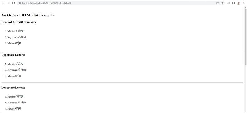 ਆਰਡਰਡ ਲਿਸਟ : ਆਰਡਰਡ ਲਿਸਟਾਂ ਦੀ ਵਰਤੋ ਉਸ ਸਮੇਂ ਕੀਤੀ ਜਾਂਦੀ ਹੈ ਜਦੋਂ ਲਿਸਟ ਵਿੱਚ ਆਈਟਮਾਂ ਦਾ ਕ੍ਰਮ ਮਹੱਤਵ ਰੱਖਦਾ ਹੋਵੇ।ਇਸ ਲਿਸਟ ਨੂੰ ਨੰਬਰਡ ਲਿਸਟ ਵਜੋਂ ਵੀ ਜਾਣਿਆ ਜਾਂਦਾ ਹੈ ਕਿਉੰਕਿ ਇਹ ਲਿਸਟ ਆਈਟਮਾਂ ਨੂੰ ਸੰਖਿਆਤਮਕ ਕ੍ਰਮ ਵਿਚ ਦਰਸਾਉਂਦਾ ਹੈ।HTML ਡਾਕੂਮੈਂਟ ਵਿੱਚ ਇਸ ਕਿਸਮ ਦੀ ਲਿਸਟ ਬਣਾਉਣ ਲਈ <OL> ਟੈਗ ਦੀ ਵਰਤੋਂ ਕੀਤੀ ਜਾਂਦੀ ਹੈ।ਇੱਥੇ OL ਦਾ ਅਰਥ ਹੈ ਆਰਡਰਡ ਲਿਸਟ <OL> ਟੈਗ ਇੱਕ ਪੇਅਰਡ ਟੈਗ ਹੈ।ਇਸ ਲਿਸਟ ਦੀਆਂ ਸਾਰੀਆਂ ਆਈਟਮਾਂ <OL> ਅਤੇ </OL> ਟੈਗ ਦੇ ਵਿਚਕਾਰ ਰੱਖੀਆ ਜਾਂਦੀਆਂ ਹਨ। ਅਨਆਰਡਰਡ ਲਿਸਟ ਦੀ ਤਰ੍ਹਾਂ ਇਸ ਲਿਸਟ ਦੀ ਹਰ ਆਈਟਮ ਵੀ <LI> ਟੈਗ ਨਾਲ ਸ਼ੁਰੂ ਹੁੰਦੀ ਹੈ।