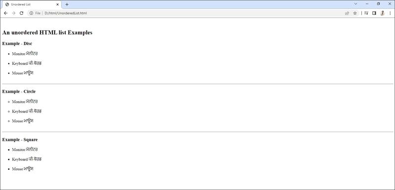 ਅਨਆਰਡਰਡ ਲਿਸਟ: ਅਨ-ਆਰਡਰਡ ਲਿਸਟ ਉਹ ਲਿਸਟ ਹੁੰਦੀ ਹੈ ਜਿਸ ਵਿੱਚ ਲਿਸਟ - ਆਈਟਮਾਂ ਦਾ ਕ੍ਰਮ ਕੋਈ ਮਹੱਤਵ ਨਹੀਂ ਰੱਖਦਾ। ਇਸ ਲਿਸਟ ਵਿੱਚ ਸਾਰੀਆਂ ਲਿਸਟ - ਆਈਟਮਾਂ ਨੂੰ ਬੁਲੇਟਸ ਨਾਲ ਦਰਸਾਇਆ ਜਾਂਦਾ ਹੈ। ਇਹੀ ਕਾਰਨ ਹੈ ਕਿ ਅਨਆਰਡਰਡ ਲਿਸਟ ਨੂੰ ਬੁਲੇਟਿਡ ਲਿਸਟ ਵਜੋਂ ਵੀ ਜਾਣਿਆ ਜਾਂਦਾ ਹੈ। HTML ਡਾਕੂਮੈਂਟ ਵਿੱਚ ਇਹ ਲਿਸਟਾਂ ਬਣਾਉਣ ਲਈ <UL> ਟੈਗ ਦੀ ਵਰਤੋ ਕੀਤੀ ਜਾਂਦੀ ਹੈ। ਇੱਥੇ UL ਦਾ ਅਰਥ ਹੈ ਅਨਆਰਡਰਡ ਲਿਸਟ। <UL> ਟੈਗ ਇਕ ਪੇਅਰਡ ਟੈਗ ਹੈ। ‌ਲਿਸਟਾਂ ਦੀਆਂ ਸਾਰੀਆਂ ਆਈਟਮਾਂ <UL> ਅਤੇ </UL> ਟੈਗਜ ਵਿਚਕਾਰ ਰੱਖੀਆ ਜਾਂਦੀਆਂ ਹਨ। ਇਸ ਲਿਸਟ ਦੀ ਹਰ ਆਈਟਮ <LI> ਟੈਗ ਨਾਲ ਸ਼ੁਰੂ ਹੁੰਦੀ ਹੈ, ਜਿਸਦਾ ਅਰਥ ਹੈ ਕਿ ਲਿਸਟ ਆਈਟਮ। ਅਸੀ <UL> ਟੈਗ ਦੇ Type ਐਟਰੀਬਿਊਟਜ਼ ਦੀ ਮਦਦ ਨਾਲ ਬੁਲੈਟਸ ਦੀ ਕਿਸਮ ਵੀ ਬਦਲ ਸਕਦੇ ਹਾਂ।
