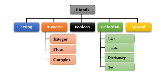Literals are fixed values that are used in the source code of a program. These values are usually assigned to program elements, such as variables, etc. The different types of literals used in Python are shown in the chart shown below: